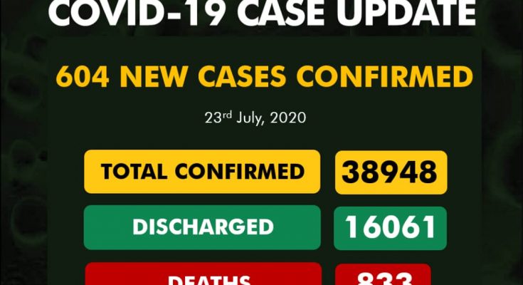 The NCDC in its update on Covid-19 in Nigeria as at Thursday 23rd of July 2020, stated that 604 new cases were confirmed while 20 deaths were recorded.