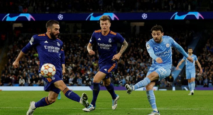 The summary of the match is as follows, Kevin De Bruyne opened the scoring with a header from Riyad Mahrez cross in just the second minute.11 minutes after the first goal, De Bruyne then teed up team-mate Gabriel Jesus to double the home side’s lead.Karim Benzema then halved the deficit out of nowhere with a brilliant first-time finish before half-time.While Phil Foden restored his side’s two-goal lead with a close range header from Fernandinho’s brilliant cross. One of the outstanding performances in today’s Champions League Semi-Final was recorded when Vincius Jr responded for the visitors immediately after Foden’s goal for City, with a fine finish after a stunning individual run that ridiculed Fernandinho’s experience and put his ability in doubt. Bernardo Silva made it four for City before Benzema pulled one back with an outrageous Panenka penalty